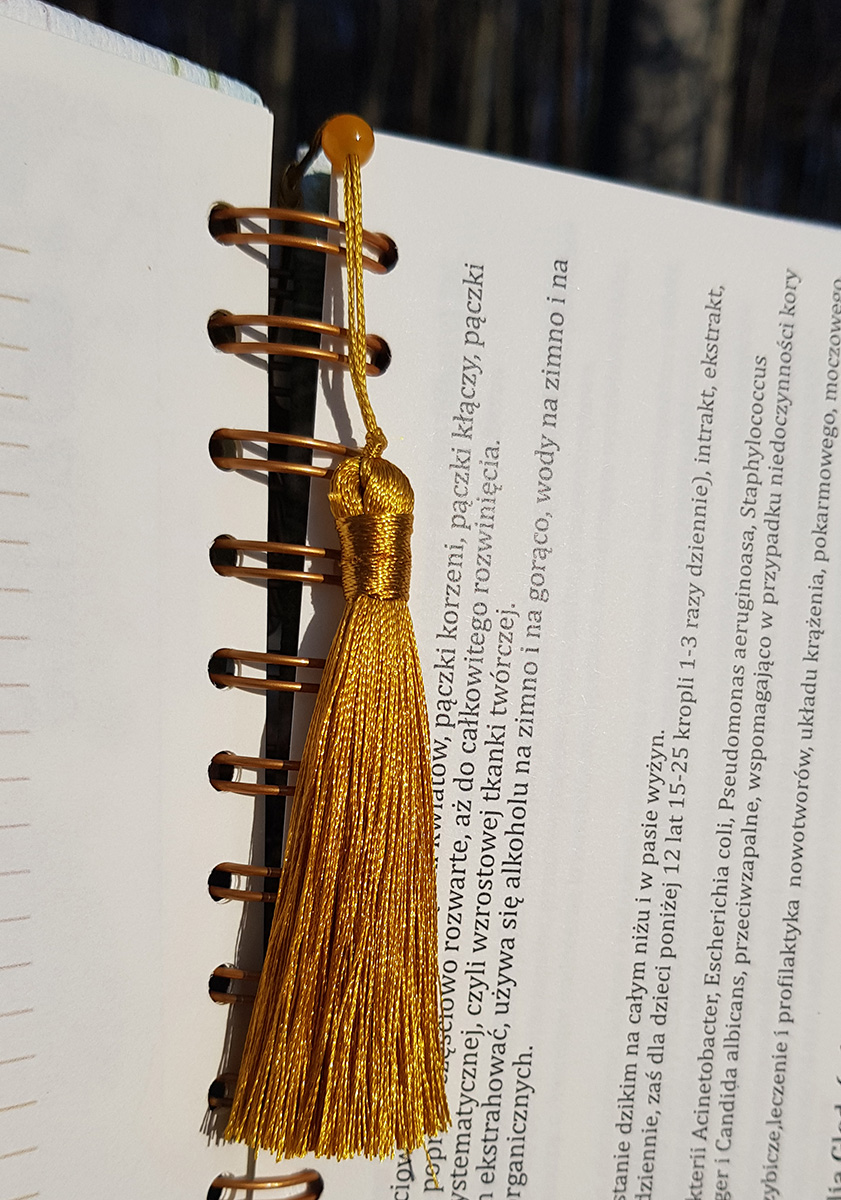 4 opinie dla Miłorząb – złota zakładka z metalowym liściem miłorzębu, koralikiem i chwostem.