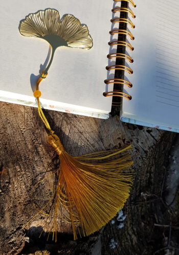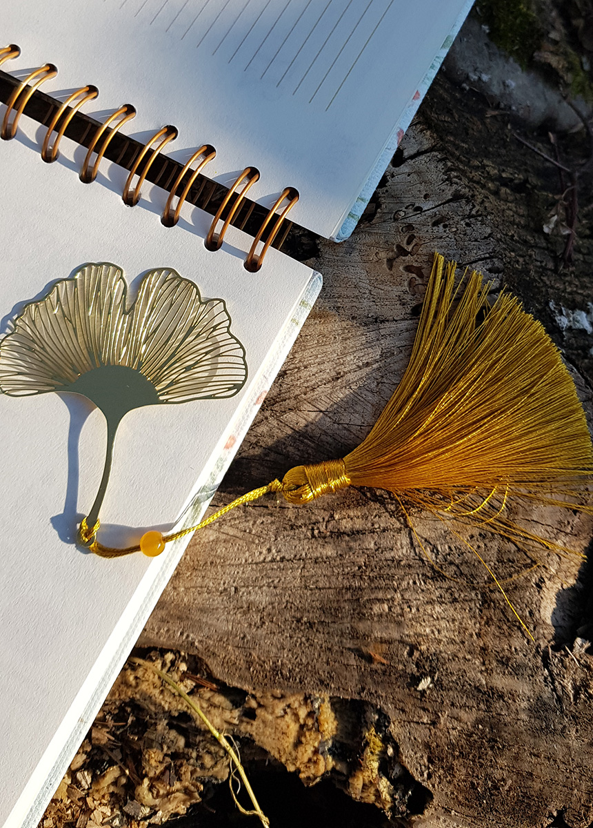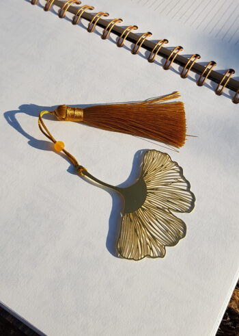 Miłorząb – elegancka złota zakładka z metalowym liściem miłorzębu, koralikiem i chwostem.